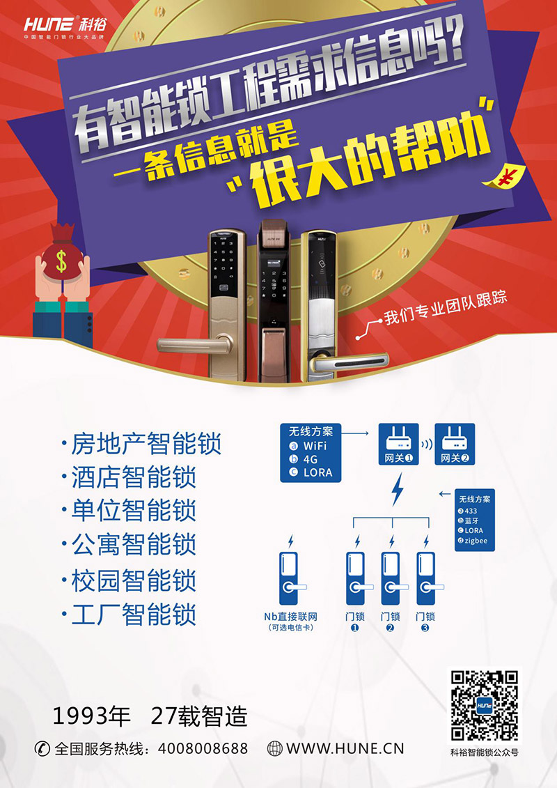 您知道有工程需要智能鎖嗎?您有智能鎖工程需求信息嗎?告訴我們!一條信息就是莫大的幫助,您的寶貴信息,我們將誠意感謝!