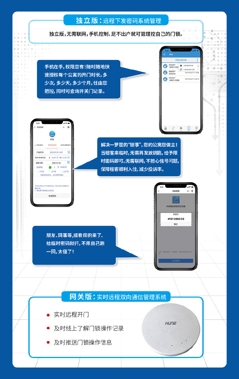 科裕長短租智能門鎖系統(tǒng)解決方案,摒棄了傳統(tǒng)人工送鑰匙、挨家挨戶的登記入住人員信息的運(yùn)營方式,能為出租屋和民宿經(jīng)營高效賦能,解決成本高、管理難等問題。據(jù)分析,選用科裕出租房公寓聯(lián)網(wǎng)智能門鎖,在云端解決這些事情,智能門鎖方案的運(yùn)營成本為傳統(tǒng)機(jī)械門鎖的不到1/4,減少了成本,也很安全。讓租客和民宿賓客更安心,令公寓和民宿經(jīng)營者更省心。