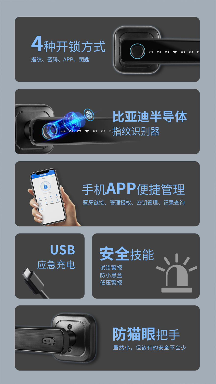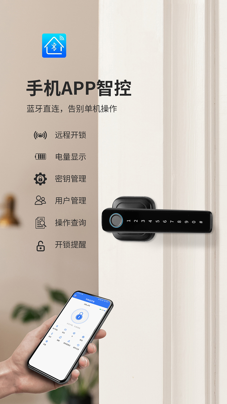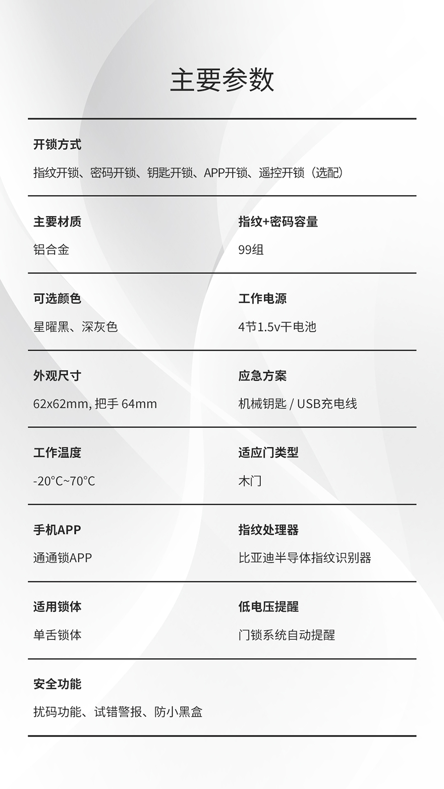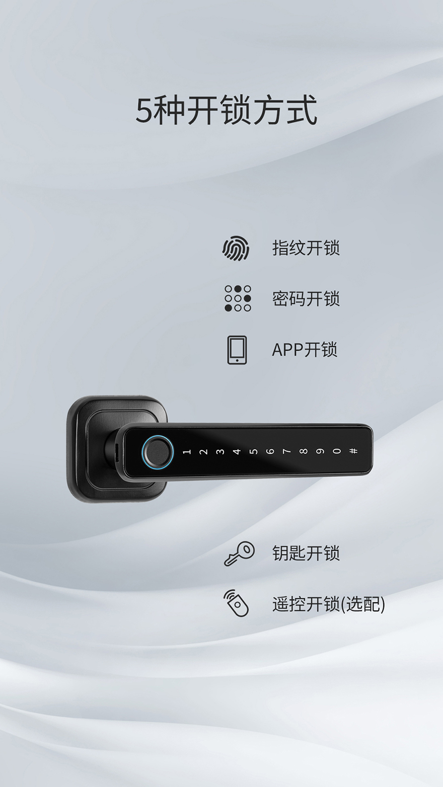 開鎖方式:指紋開鎖、密碼開鎖、鑰匙開鎖、APP開鎖、遙控開鎖(選配)