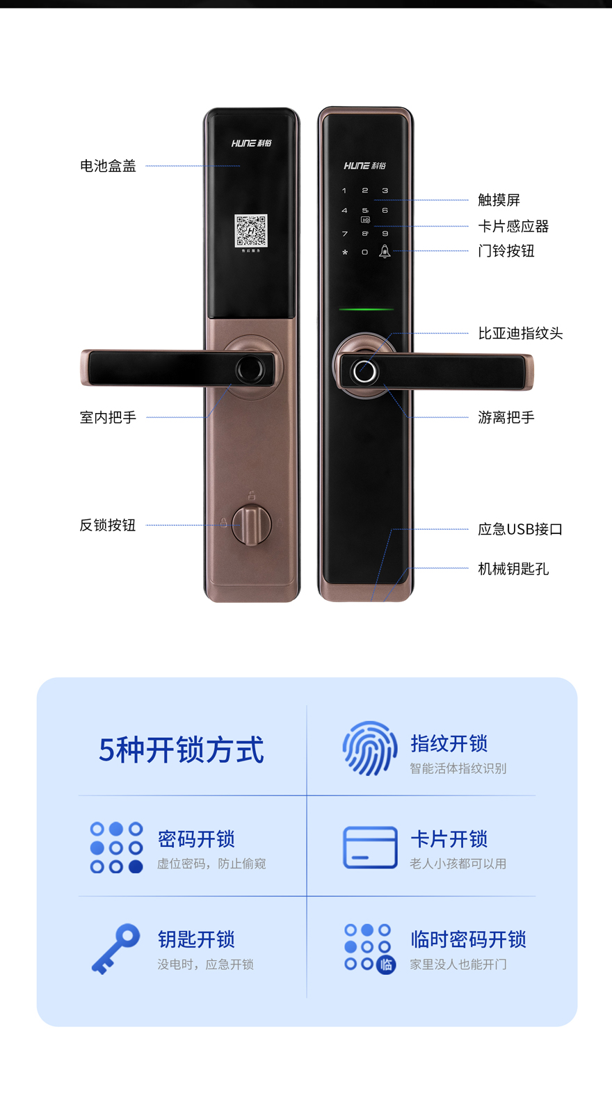開門方式:指紋、密碼、鑰匙、感應(yīng)卡、微信臨時(shí)密碼