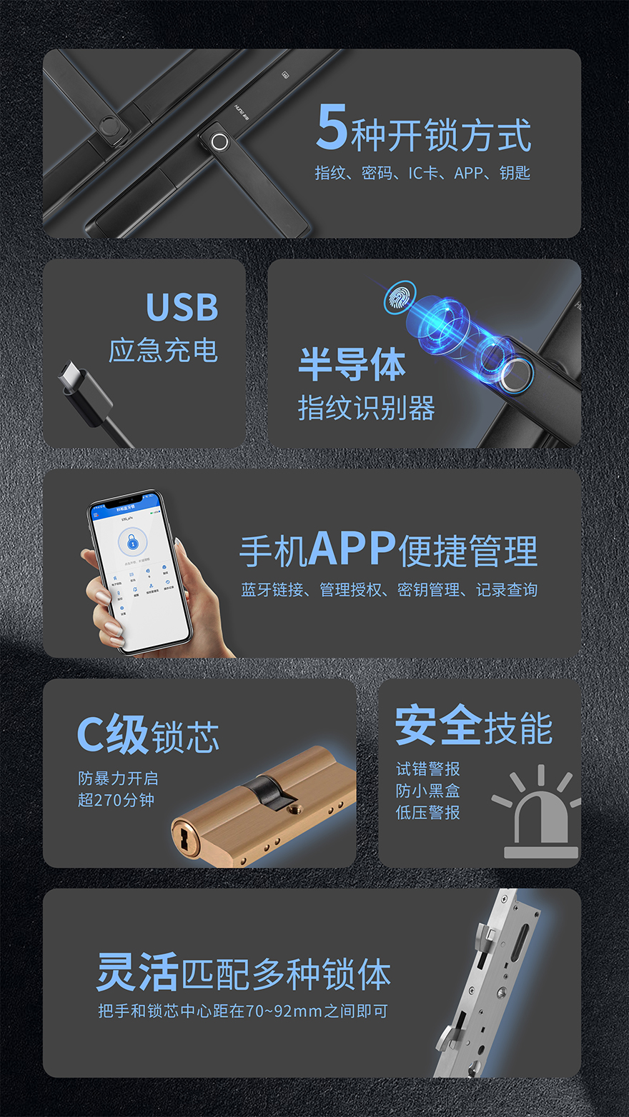 開門方式:指紋、密碼、鑰匙、感應卡、APP開鎖
