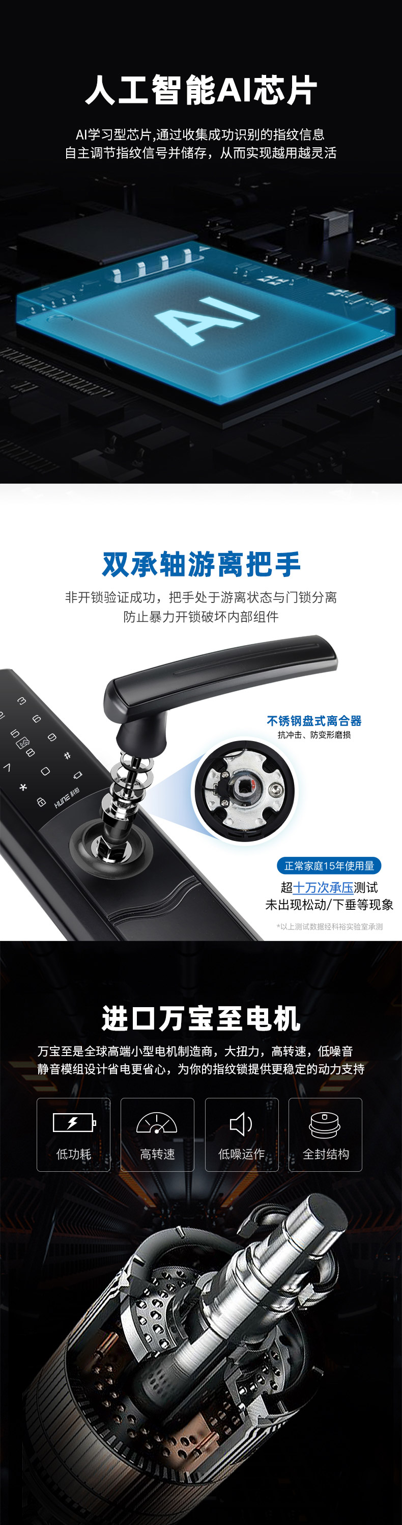 1、外觀簡(jiǎn)約時(shí)尚,鉆化ledI屏設(shè)計(jì)反應(yīng)靈紋,7層噴涂工藝處理質(zhì)感細(xì)膩,雙軸套把手設(shè)計(jì),使用舒適,多種開鎖方式,可手機(jī)遠(yuǎn)程操控,